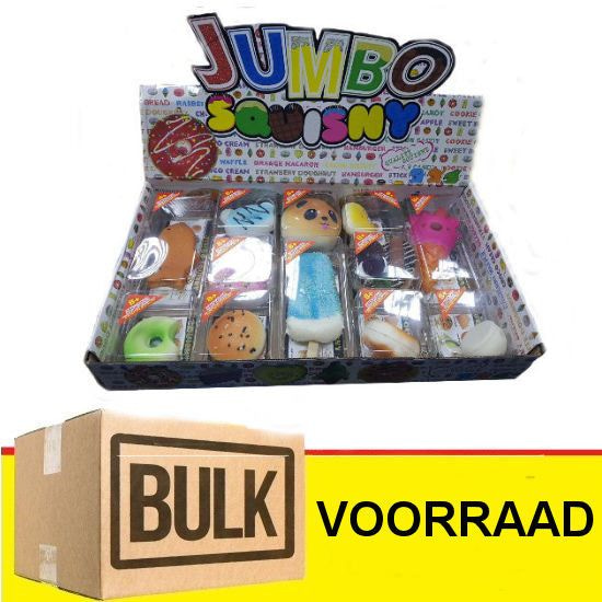 Jumbo Squisny verpakt in een Display, met 12 verschillende Jumbo Squisnies in 1 display.