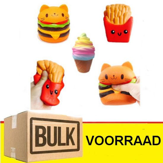 Een Display bevat mix Squisny's artikelen, B.v. Emoij's, hamburgers, vissen en donuts etc.
