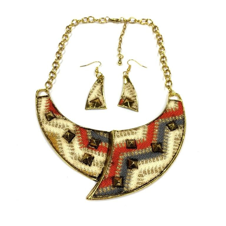 S_600566A - AZTEK HALSKETTING EN OORBELLEN MET STUDS CRÈME/ORANJE/GRIJS (1st)