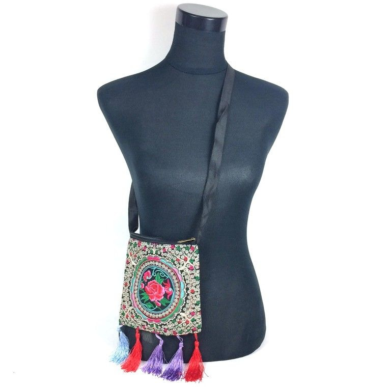 S_812013I - HAND/SCHOUDERTAS BLOEM ZWART/MULTICOLOR MET KWASTJES(1st)