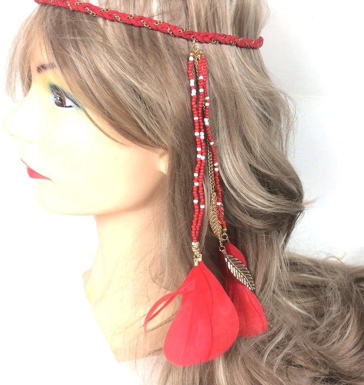 S_600113C - IBIZA LOOK GEVLOCHTEN HAARBAND MET VEREN EN KRALEN ROOD (1st)