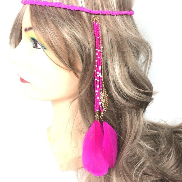 S_600113D - IBIZA LOOK GEVLOCHTEN HAARBAND MET VEREN EN KRALEN FUCHSIA (1st)