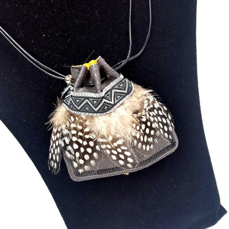 S_619117C - HALSKETTING LEER MET BUIDEL EN VEREN GRIJS/ZWART (1st)