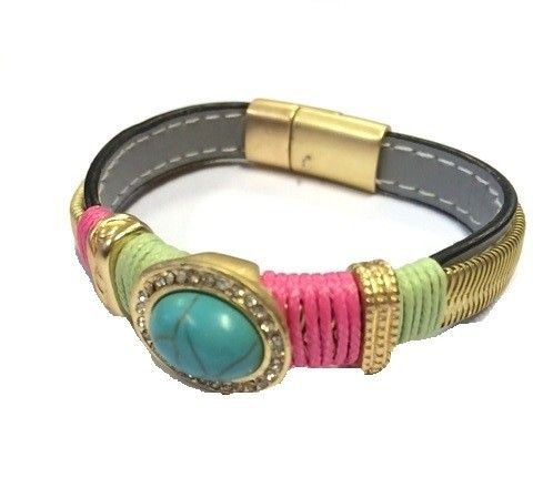 S_600800N - ARMBAND ZILVER MAGNEETSLUITING - GROEN/ROZE STUDS (1st)