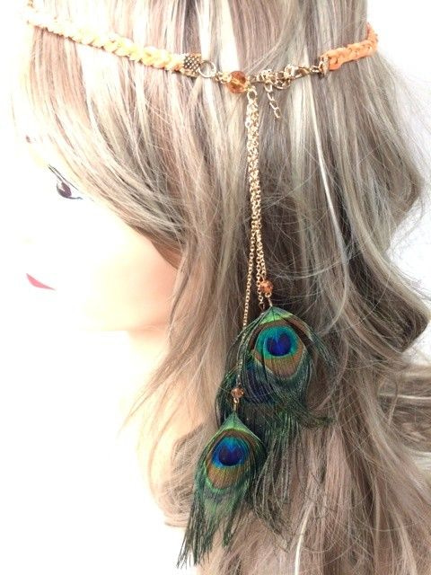 S_600029G - IBIZA LOOK GEVLOCHTEN HAARBAND ORANJE/ZALM MET PAUWENVEREN (1st)